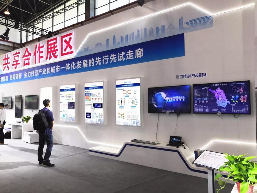 在共享合作展区,有技术转移界“天猫商城”之称的江苏省技术产权交易市场作为重点展项亮相,吸引观众驻足。