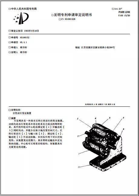 1985年4月1日,江苏省徐州市新沂县的个人申请人胡书彬提交了我省第一件专利申请,专利号:85100152.1,专利名称:柔性滚柱变速装置,技术领域:机械工程-机器零件。该项发明提出一种改进的具有柔性行星滚柱的变速装置,它具有变速范围大、零转速输出、正反换向以及无级变速的功能。