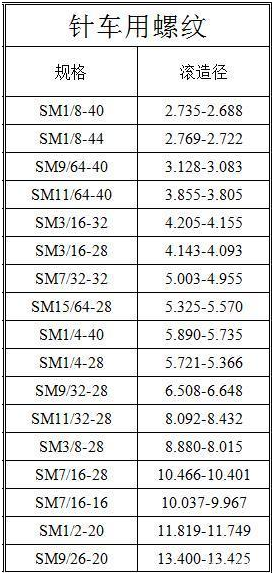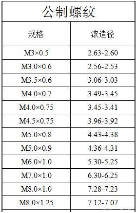 下面我们一起来看看常见螺纹规格中各型号、规格及孔径、滚造径大小:
