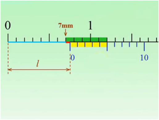 按照刚才的方法我们来读数,游标0刻度以左读主尺,可读出有7个刻度,即主尺为7毫米。