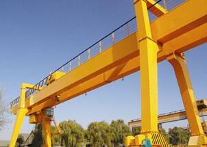 门式起重机的系统结构组成包括沿左右方向延伸的主梁,主梁的左、右端分别固连有支腿,支腿上装配有处于两支腿之间且沿前后方向分布或沿前后方向延伸的用于放置杆状物料的支撑体。门式起重机的支腿上装配有用于放置杆状物料的支撑体,施工时,将杆状物料如铁轨放置在支撑体上,杆状物料及支撑体随起重机一起移动,这样在施工现场就由起重机运输杆状物料,省去了施工现场必须的运输车辆,从而可以降低施工成本,提高了施工效率。
