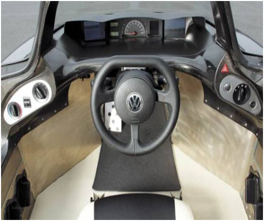为了达到1升的耗油量目标,风阻系数必须严格控制,1升车确定有2个座位,而车前部必须尽可能的小,这才附合空气动力学,仅有的选择是将2个座位成一条直线排列,就像竞速的滑雪长橇以及滑翔机一样。入口是一个1.5米长的欧翼式车门,从左边开启,这样进出更加方便。