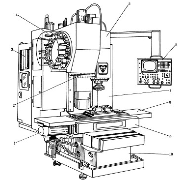 1-主轴头 2-刀库 3-立柱 4-立柱底座 5-工作台 6-工作台底座