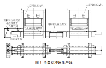 全自动冲压生产线就是将各类技术集中与一体的大型自动冲压生产线,生产线上有多台精密压力机同时进行工作。原材料的加工与运输可以通过电机驱动的机械手来得以实现,而现场总线控制机械手和大型精密压力机则是对现场进行故障监控与诊断,在生产金属零件的过程中,实现全自动冲压的生产线。以下图中的两台主机连线金属零件冲压加工为例,机器人全自动冲压生产线主要由双积料自动交换以及送料装置、大型精密压力机、三维机械手送料装置、伺服驱动半送装置等组成(见图1)。