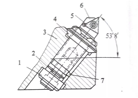 1 垫圈 2 拉紧螺钉 3 镗刀杆 4 调整螺帽 5 刀片 6 镗刀头 7 导向链