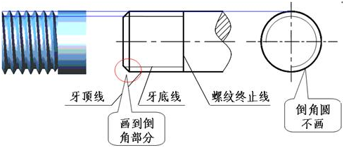 外螺纹不论其牙形如何,螺纹的牙顶(大径)及螺纹终止线用粗实线表示,螺杆的倒角或倒圆部分也应画出;牙底(小径)用细实线表示。
