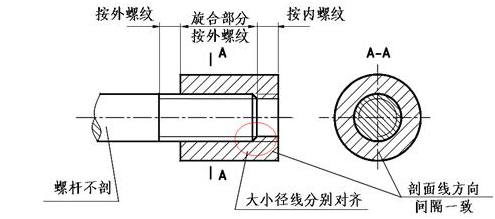 当内外螺纹的牙型、大径、小径、螺距、线数及旋向都相同时,才可以连接在一起。在剖视图中,表示外螺纹牙顶的粗实线,必须与表示内螺纹牙底的细实线在一条直线上;表示外螺纹牙底的细实线,也必须与表示内螺纹牙顶的粗实线在一条直线上,即内外螺纹的大径和小径分别对齐。