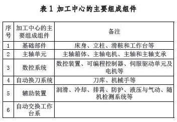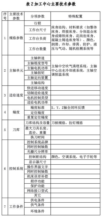一般加工中心的主要组成组件如表1,其主要技术参数及配置如表2,内容涵盖了与工件加工相关的尺寸重量参数、主轴单元参数、进给参数、精度指标、刀库参数、控制系统及相关配置等。经过论证选型的设备需包括表1、表2 中的内容,且覆盖三家以上设备的主要技术参数。