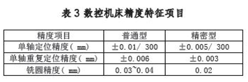 (1)定位精度和重复定位精度定位精度和重复定位精度是十分重要的精度指标,其取决于数控机床的几何精度、机床的测量系统精度、进给控制系统的精度和刚度及其动态特性等因素。通常数控机床精度检验项目有20 ~ 30 项,但其最有特征的项目是表3 所示的单轴定位精度、单轴重复定位精度和两轴以上联动加工出试件的圆度。定位精度和重复定位精度综合反映了该轴各运动部件的综合精度,尤其是重复定位精度,它反映了该轴在行程内任意定位点的定位稳定性,这是衡量该轴能否稳定可靠工作的基本指标。目前,数控系统中的软件都有丰富的误差补偿功能,能对进给传动链上各环节系统误差进行稳定的补偿。铣圆精度是用来综合评价数控机床有关数控轴的伺服系统的跟随运动特性,是数控系统插补功能的指标。在选择加工中心精度时,应注意定位精度不是机床的加工精度,但从机床定位精度可估算出该机床加工时能达到的精度,如在单轴上移动加工两个孔的孔距精度约为单轴在该段定位误差的1 ~ 2 倍(具体误差值与工艺因素密切相关)。普通型加工中心已可加工6 ~ 7 级精度工件,精密级加工中心可加工5 级精度工件。