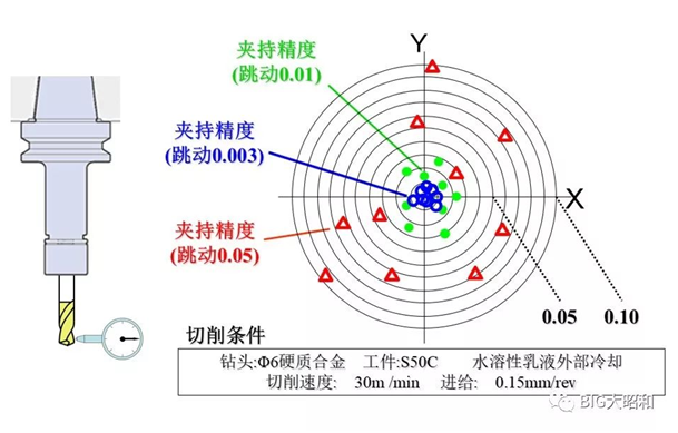 刀柄的跳动精度和加工精度有着直接的关系,比如以钻孔为例,从加工实例来看,不同跳动精度的刀柄在相同的加工条件下,钻出来孔的位置精度和孔径的尺寸精度有着天壤之别。在这一点上,孔精度不良,很多客户往往认为是钻头本身的问题,从而花费大量的时间和精力来调整钻头。因此,丧失了产品品质和效率的竞争力。