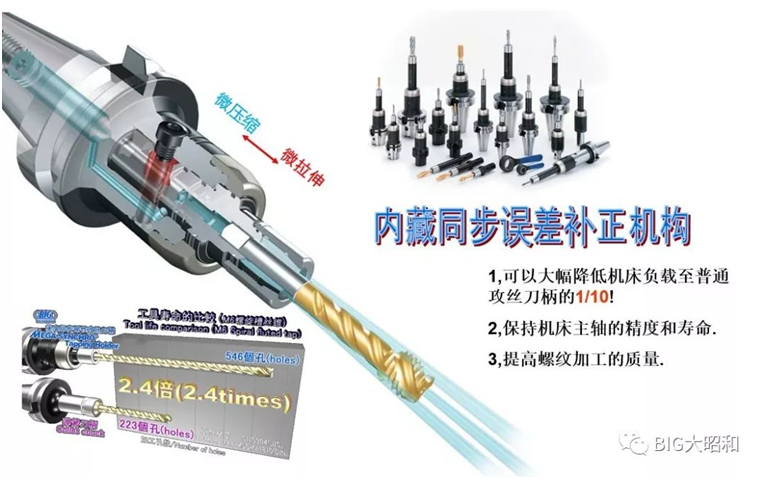 使用下图这样的美夹同步攻丝刀柄就能解决这个问题,主要是在刀柄中间添加了一种特殊的轴向缓冲机构,消除同步误差。可以提高螺纹精度,大幅延长丝锥寿命。