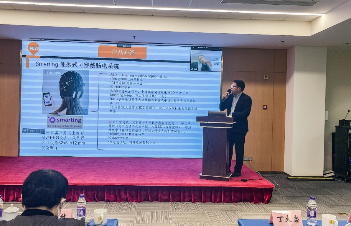 冠名企业南京尖创科技有限公司张俊峰总经理以《脑电技术及应用》为题介绍了脑电信号的产生、采集原理及脑电应用,从人因工程应用的视角对公司产品和项目实践进行了深入介绍。