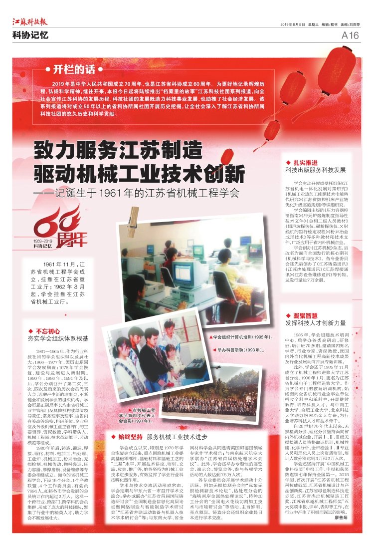 6月5日出版的《江苏科技报》,大红主色调的A16整版, “致力服务江苏制造,驱动机械工业技术创新”的醒目标题,报道了 近60年的发展历程。这是《江苏科技报》,在纪念新中国成立70周年、江苏省科协成立60周年之际,推出的“档案里的故事”开栏首篇重磅系列报道。