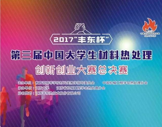 7月21日,由教育部高等学校材料类教学指导委员会、中国机械工程学会热处理分会主办,江苏大学、 热处理分会共同承办的2017“丰东杯”第三届中国大学生材料热处理创新创业大赛总决赛在江苏大学隆重举行。来自清华大学、南京理工大学、武汉理工大学、中国矿业大学、江苏大学、江苏丰东热处理及表面改性工程技术研究有限公司等24个高校、企业的30支代表队参加了本次总决赛。