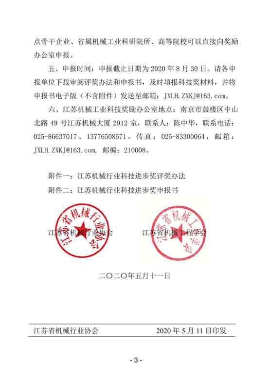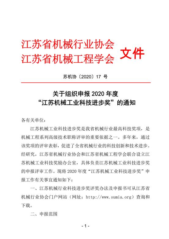 关于组织申报2020年度江苏机械工业科技进步奖”的通知