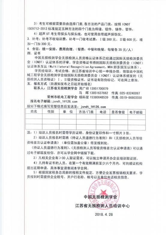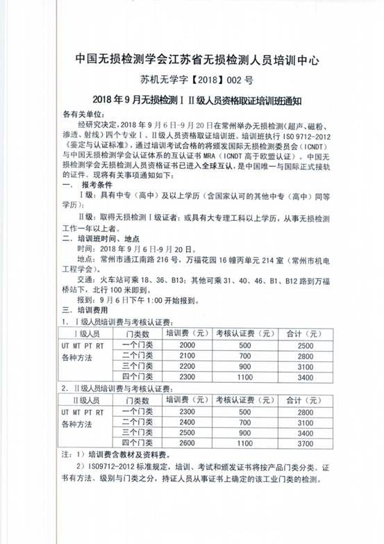 中国无损检测学会江苏省无损检测人员培训中心------2018年9月无损检测1、2级人员资格取证培训班通知