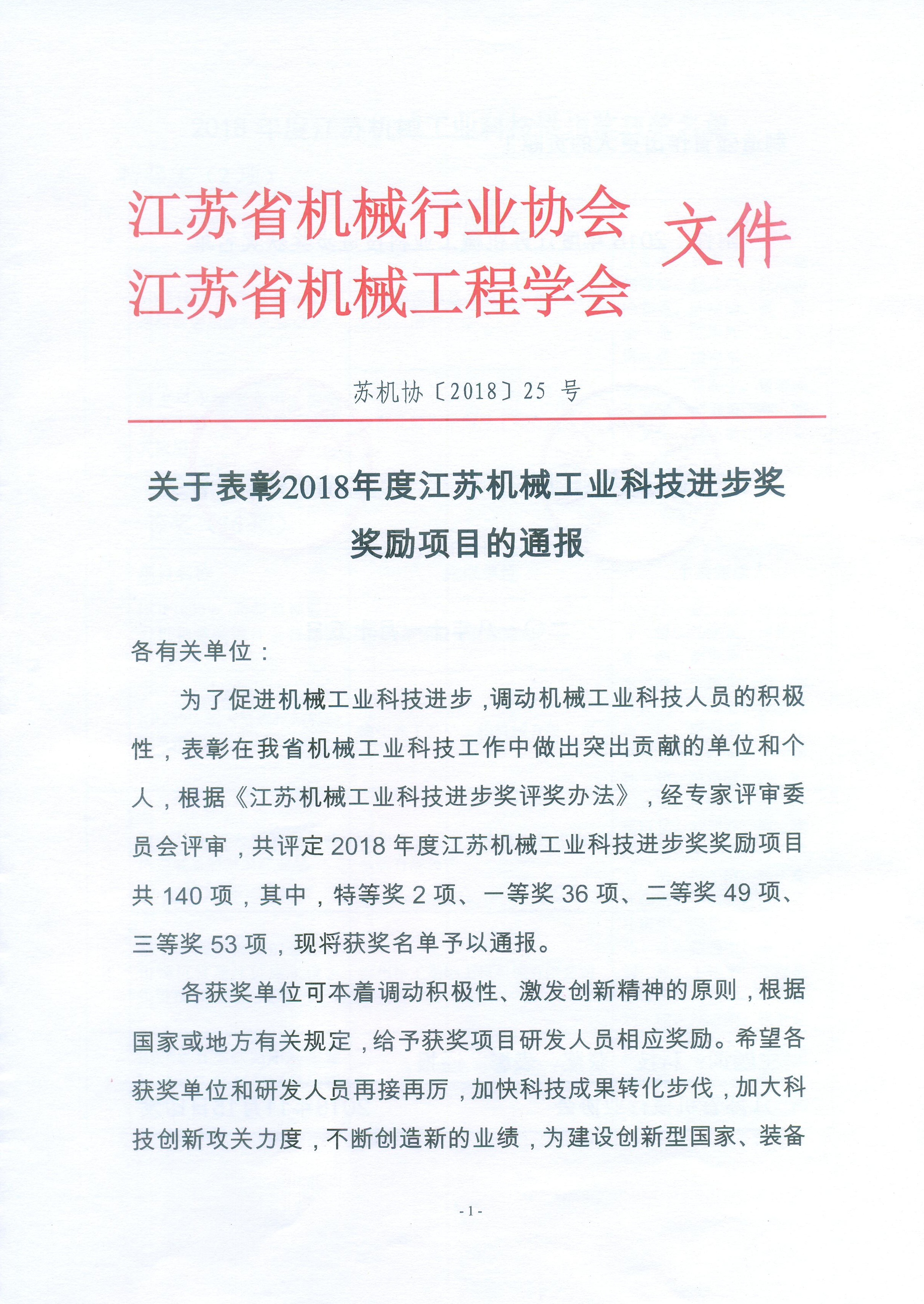 关于表彰2018年度江苏机械工业科技进步奖获奖项目的通报