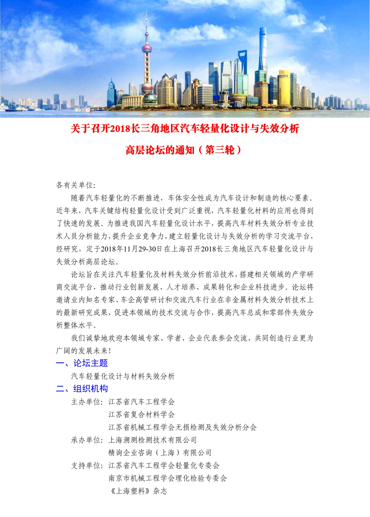 关于召开2018长三角地区汽车轻量化设计与失效分析高层论坛的通知