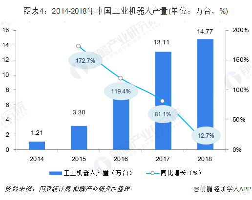 机器人、包装机械及医疗设备市场则保持较快增长,带动伺服电机需求市场增长。根据国家统计局数据,2018年,中国工业机器人产量为14.77万台,同比增长12.7%,根据中国电子学会数据,2018年中国服务机器人市场增长约为43.9%,2018年整体机器人市场增速在22%左右。