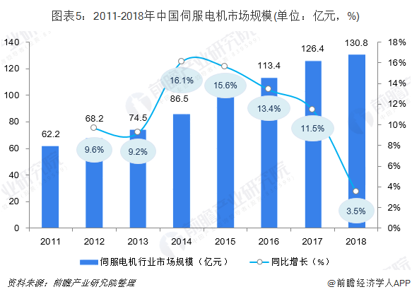 通过测算,2018年,下游市场需求对伺服电机市场增长贡献率为3.5%左右,按此增速,2018年,中国伺服电机的市场规模为130.8亿元。