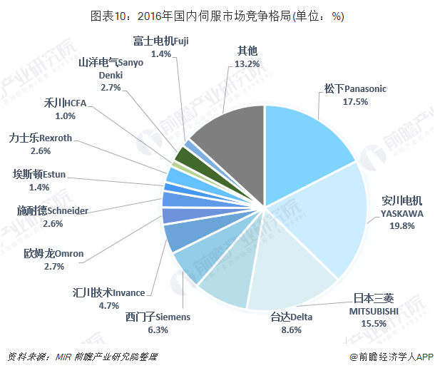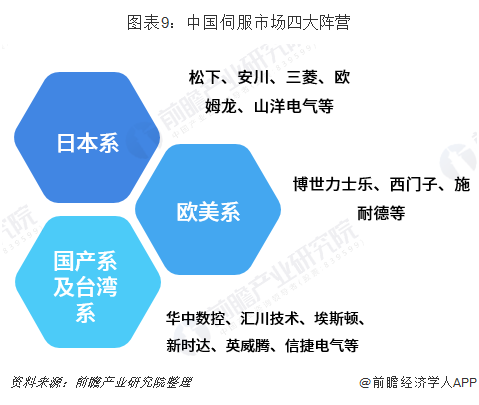 中国伺服市场分为日系、欧美系、台湾系、国产品牌四个阵营。日系品牌凭借良好的产品性能与极具竞争力的价格垄断了中小型oem(设备制造业)市场,以松下、安川、三菱为代表;