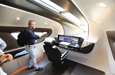 参观人员在时速600公里高速磁浮试验样车上参观。